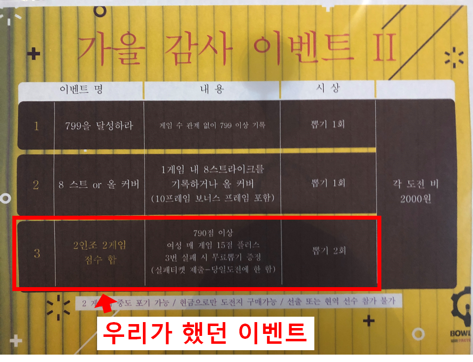| 볼링장 | 이벤트 | 참가비 | 게임비 | 비고 |