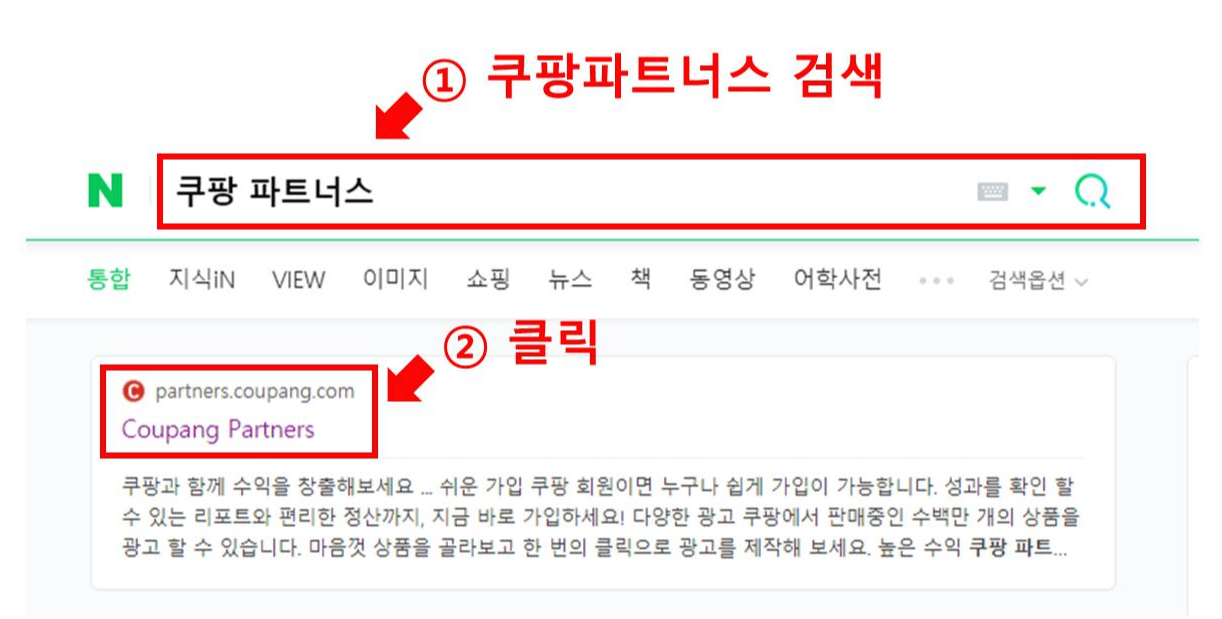 먼저 검색사이트(네이버,다음 등)에서 ①쿠팡파트너스를 검색합니다.