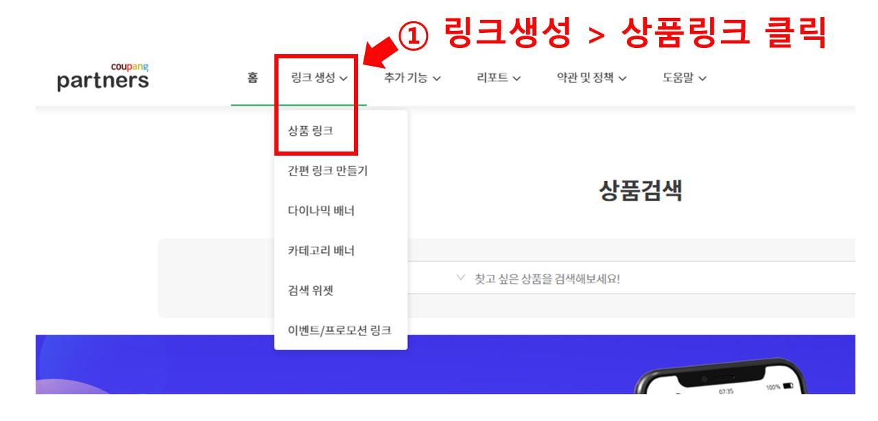먼저 쿠팡파트너스로 접속 후 상단 탭 중 ①링크생성 > 상품링크를 클릭합니다.