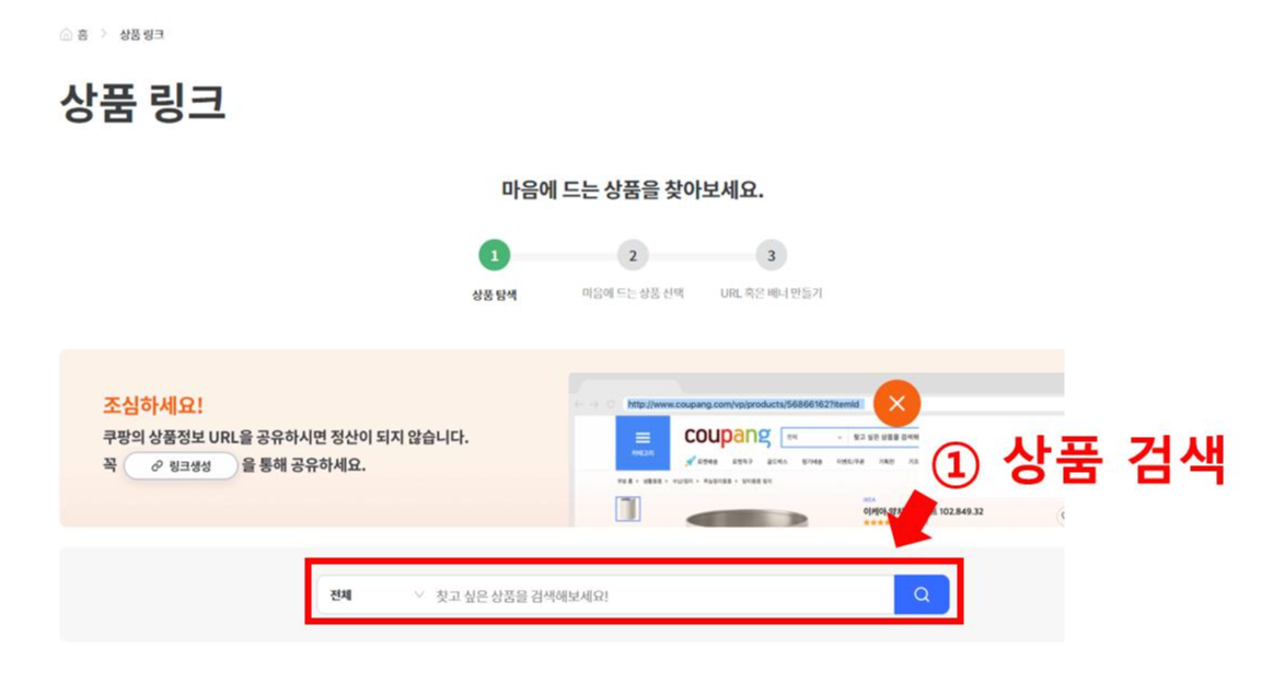 상품링크 화면이 뜨면 검색 창에 ①원하는 상품을 검색합니다.