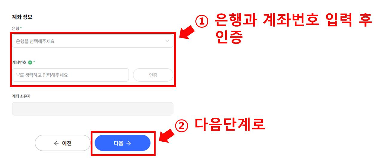 ① 은행과 계좌번호를 입력하고 인증을 누르면 계좌소유자는 자동으로 입력됩니다.