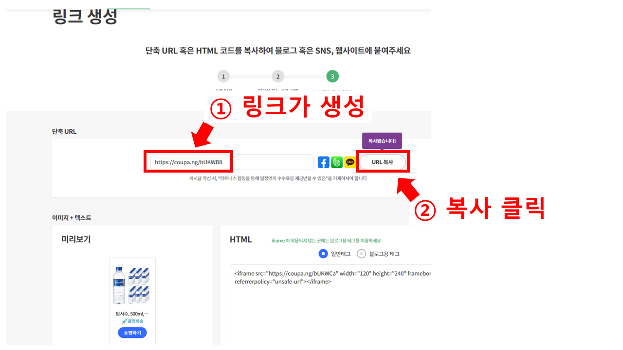 생수로 검색된 여러가지 상품 중 원하는 상품에 마우스를 올려서 ①링크생성 버튼을 클릭합니다.