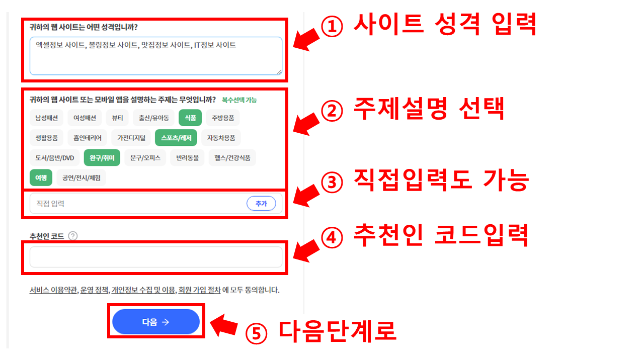 추천인코드까지 입력이 끝났다면 ⑤다음단계로 넘어 갑니다.